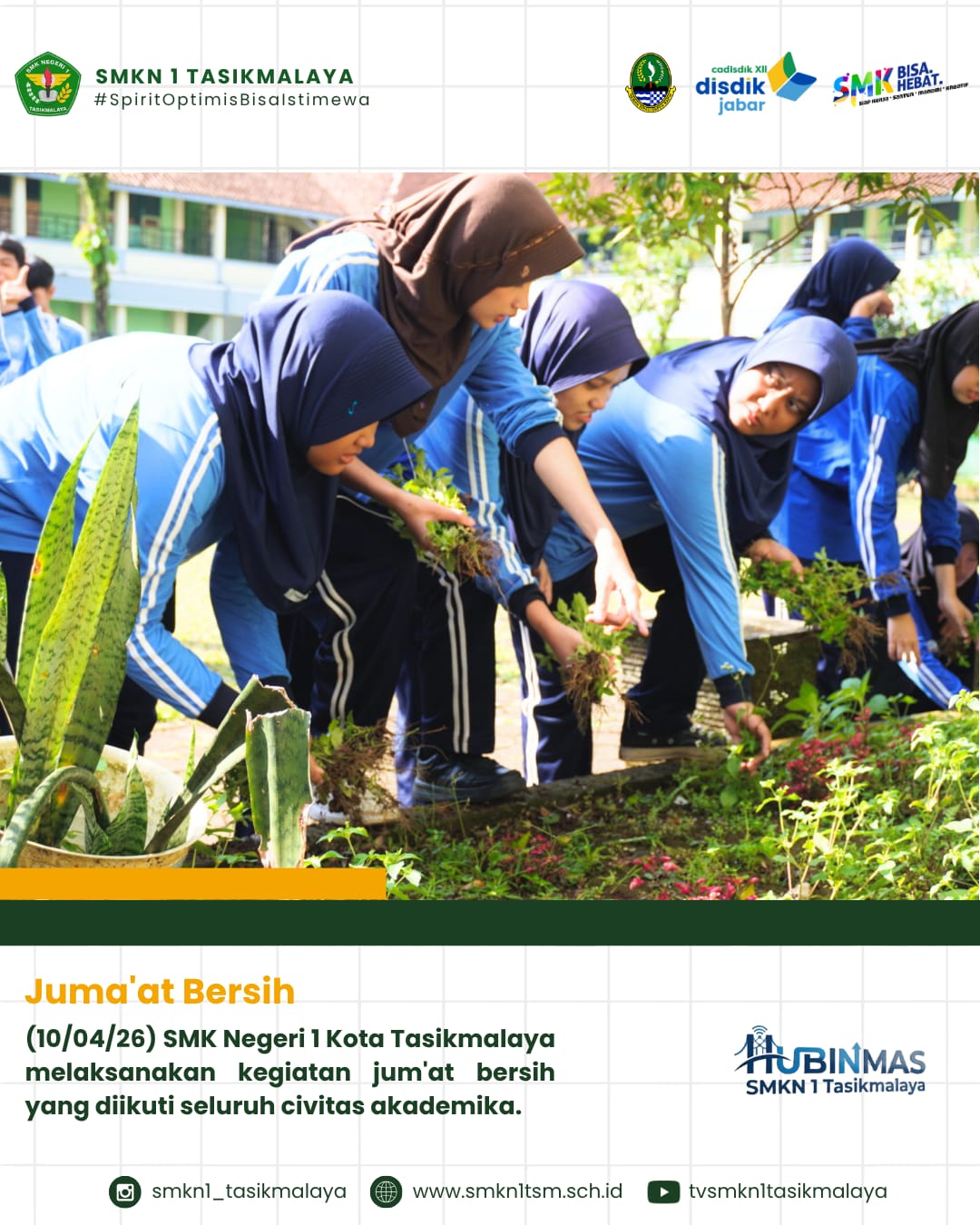 Tasikmalaya, 10 April 2026 — SMK Negeri 1 Kota Tasikmalaya kembali melaksanakan kegiatan rutin Jum’at Bersih yang diikuti oleh seluruh civitas akademika. Kegiatan ini menjadi salah satu upaya sekolah dalam menanamkan budaya hidup bersih, sehat, dan peduli lingkungan kepada seluruh warga sekolah.