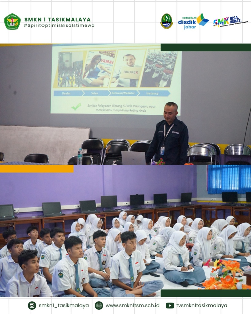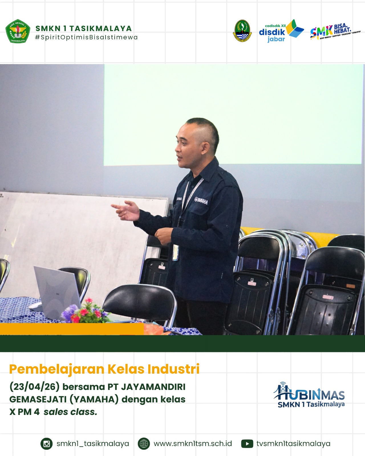 Tasikmalaya, 23 April 2026 — SMKN 1 Tasikmalaya kembali melaksanakan kegiatan Pembelajaran Kelas Industri sebagai upaya memperkuat keterkaitan antara dunia pendidikan dan dunia kerja. Pada kesempatan kali ini, kegiatan menghadirkan narasumber dari PT Jayamandiri Gemasejati (Yamaha) yang berinteraksi langsung dengan siswa kelas X PM 4 sales class.