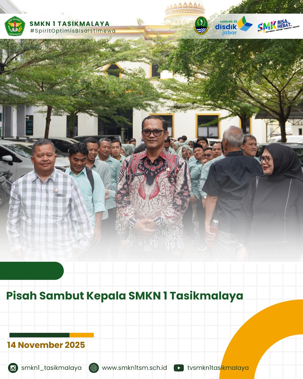 SMKN 1 Tasikmalaya melaksanakan kegiatan pisah sambut kepala sekolah sebagai salah satu momen penting dalam perjalanan lembaga. Acara ini menjadi kesempatan untuk memberikan apresiasi kepada pimpinan sebelumnya atas dedikasi dan kiprahnya, sekaligus menyambut kepala sekolah baru, Junjun Nugraha Sutisna, S.Pd., M.M., dengan diiringi oleh guru-guru dari SMKN 1 Kadipaten.