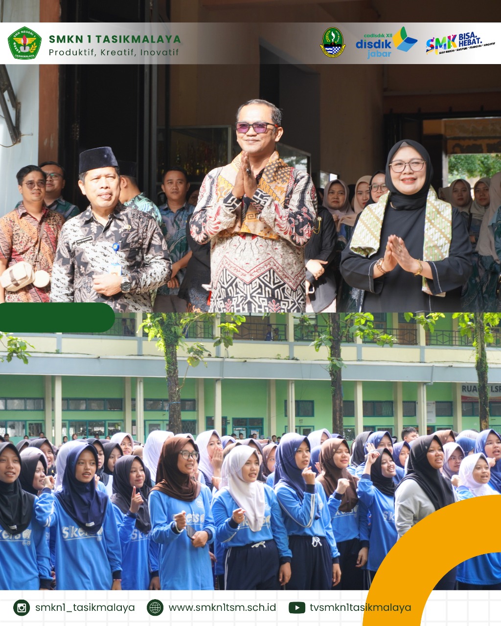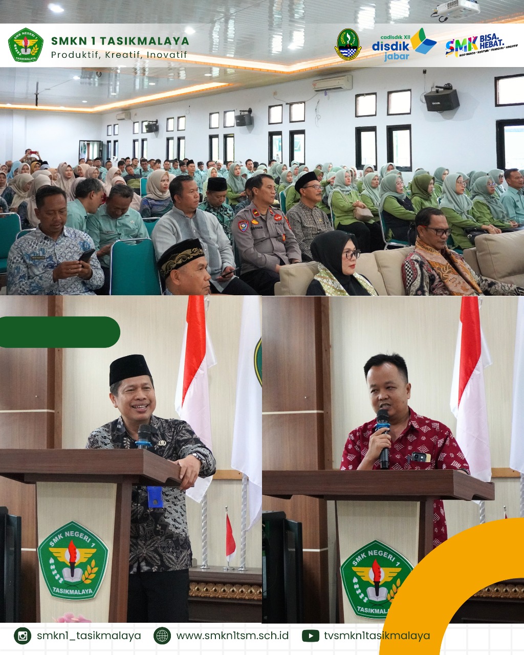 Kepala sekolah baru, Junjun Nugraha Sutisna, S.Pd., M.M., dalam sambutannya menegaskan komitmennya untuk meneruskan program-program sekolah dan menghadirkan inovasi baru yang selaras dengan kebutuhan pendidikan vokasi masa kini. Beliau juga mengajak seluruh warga sekolah untuk memperkuat kolaborasi dan budaya kerja positif dengan membawa slogan: Spirit, Optimis, Bisa, Istimewa sebagai pijakan dalam setiap langkah.