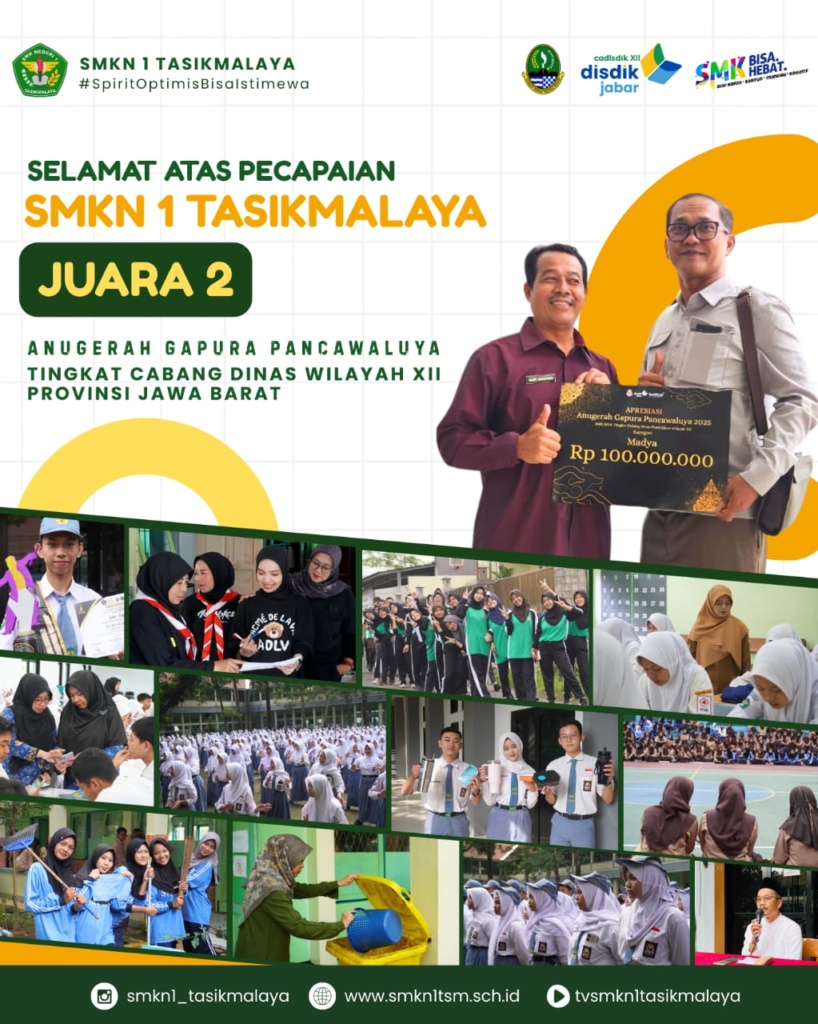 SMKN 1 Tasikmalaya kembali menorehkan prestasi membanggakan dengan meraih Juara 2 Anugerah Gapura Pancawaluya pada tingkat Cabang Dinas Wilayah XII Provinsi Jawa Barat. Capaian ini menjadi bukti nyata komitmen sekolah dalam mewujudkan ekosistem pendidikan yang berkarakter, inklusif, serta berorientasi pada penguatan nilai-nilai Pancawaluya.