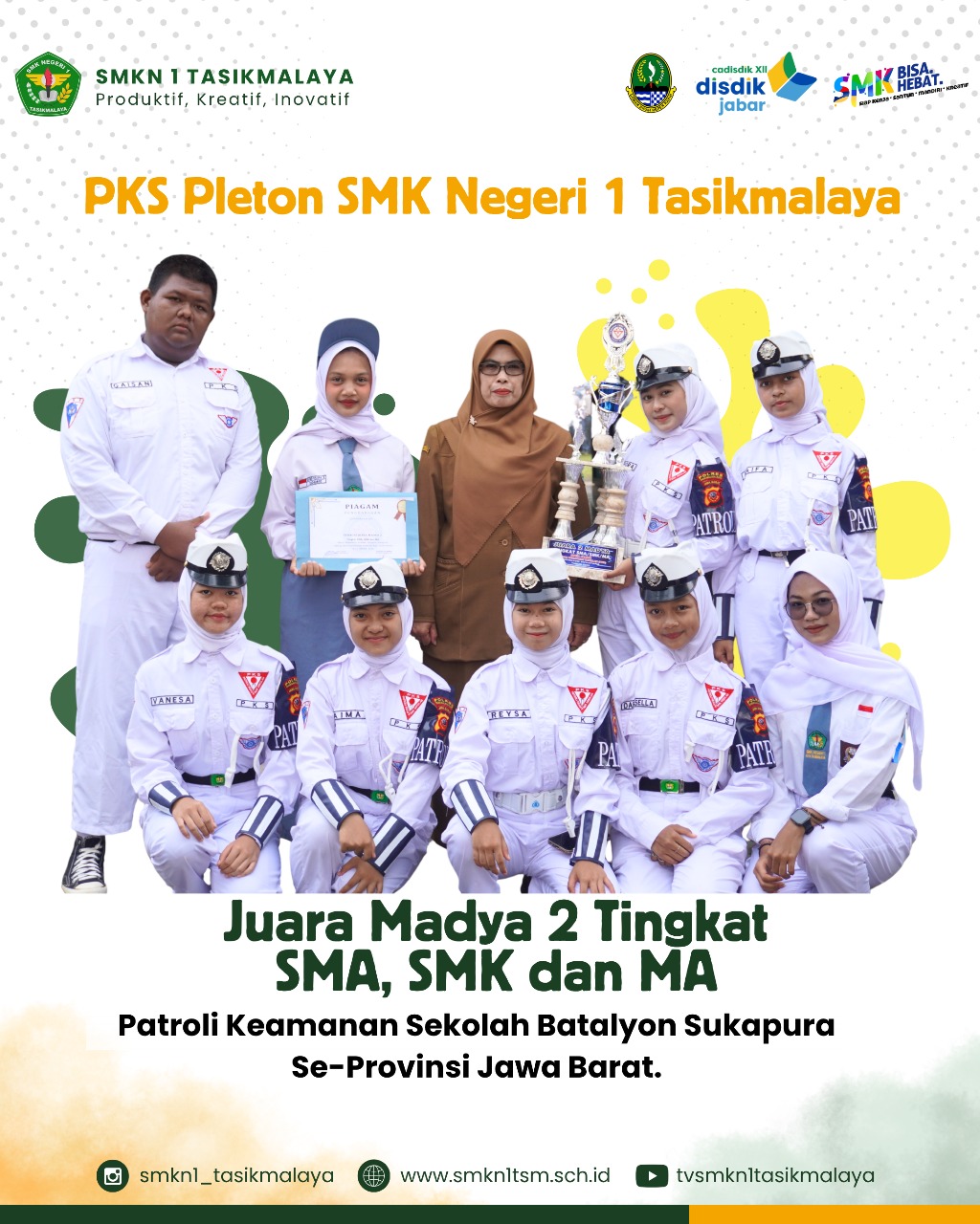Tasikmalaya – Prestasi membanggakan kembali diraih oleh SMK Negeri 1 Tasikmalaya. Tim Perwakilan PKS Pleton SMKN 1 Tasikmalaya berhasil meraih Juara Madya 2 dalam ajang Patroli Keamanan Sekolah (PKS) Batalyon Sukapura Tingkat SMA, SMK, dan MA se-Provinsi Jawa Barat.