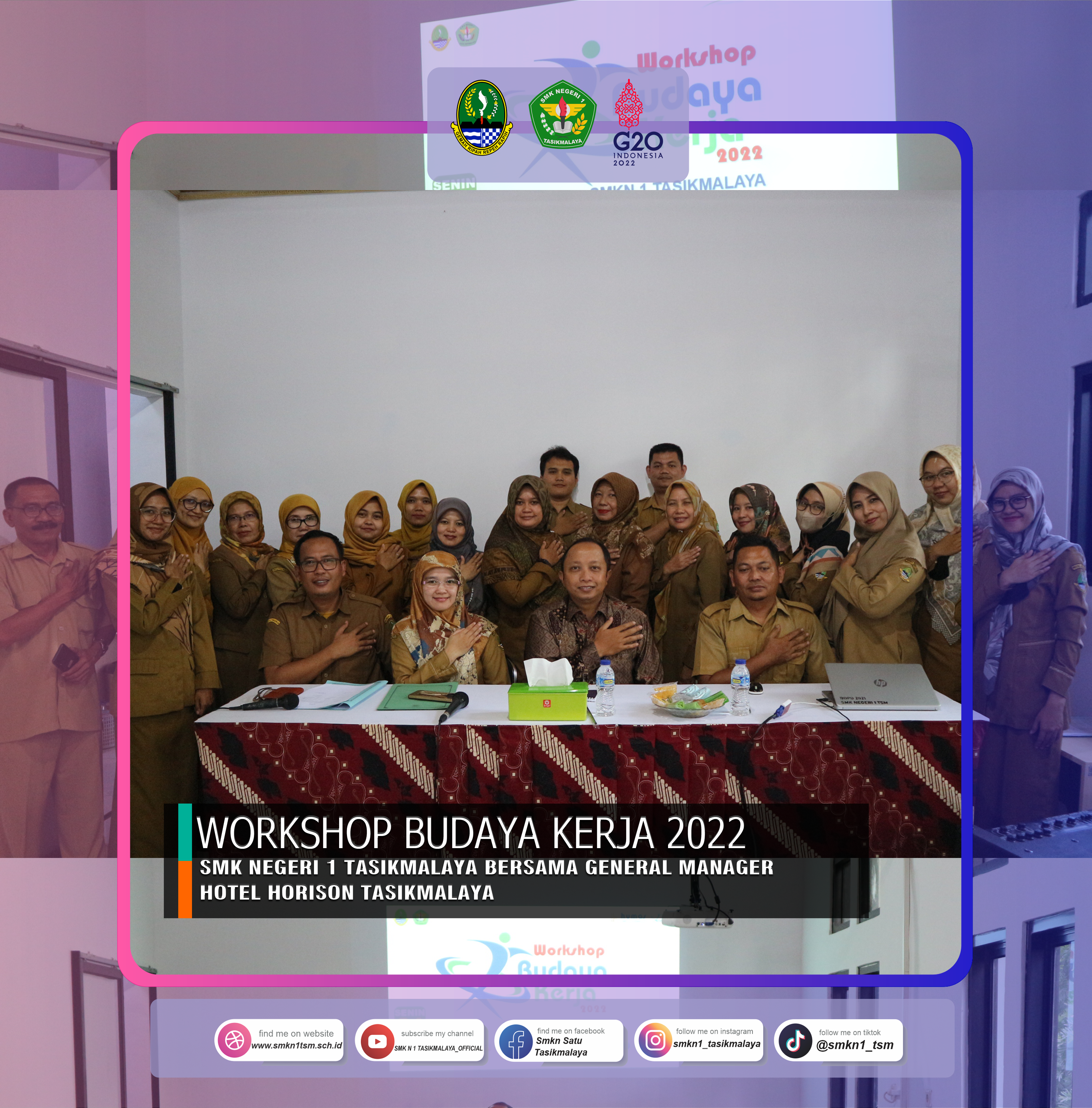 tanggal 23 Oktober 2022 telah berlangsung acara workshop budaya kerja Smk Negeri 1 tasikmalata tahun 2022 bersama naraasumber General Manager Hotel Horison Tasikmalaya, Bapak Feri Susanda. khususnya untuk para guru yang mengajar di jurusan perhotelan mengikuti acara worlshop Budaya Kerja ini.